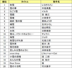 1位はレミオロメン「粉雪」、2位は中島美嘉「雪の華」、3位はイルカ「なごり雪」と、発売以来年月を経てもなお人気が絶えない、雪の名曲がトップ3に輝いた。