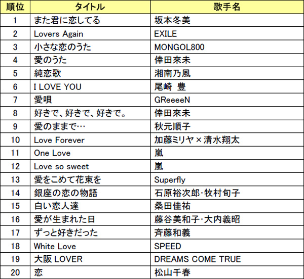 ラブソング カラオケリクエストランキング、1位は「また君に恋してる」