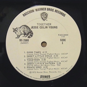 さて『Jesse Colin Young / Together』のUSオリジナル盤のレコードレーベルを見てみましょう。’72年にワーナーから発売されているので、USオリジナルは本来なら以前も色々取り上げた“鴬ワーナー”のはずなのですが、これは違っています。ワーナーのWBロゴは入っていますが、レーベル自体は白地で、アライグマの絵がついています。