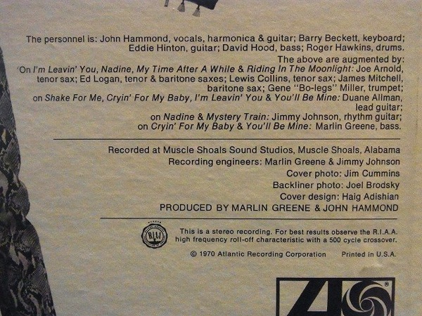 「The personnel is:」としてJohn Hammondと並んでBarry Beckett、Eddie Hinton、David Hood、Roger Hawkinsの名前がある。曲によって参加という形で「The above are augmented by:」としてDuane Allmanの名前がある。また、マッスル・ショールズの主要ミュージシャンであるJimmy Johnson、Marlin Greeneもやっぱり参加していた。ちなみにプロデュースはJohn HammondとMarlin Greeneの共同プロデュースとなっている。もちろんレコードによってクレジットの表記方法は様々。