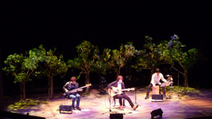 この日は前半・歌、後半・トークと二部構成になっており、まず銀色がステージに現れ軽く挨拶した後、シンガー・ソングライターの原田晃が登場。“銀色プレゼンツ”(銀色夏生の詞世界を銀色ファミリー以外の人が歌う時の総称)として今年1月に4曲入りCD『輝き』をリリースしている彼は、サポートのベースとパーカッションをバックにギター弾き語りで「夕空」「アイスコーヒー」とCDに収録されている珠玉曲を放っていく。恋のせつなさと生きていく上での真理がタペストリーのように織り込まれた透明感あふれる銀色の深い詞世界が、伸びやかであたたかみのある原田の歌声によって、立体的にその場に広がっていく。