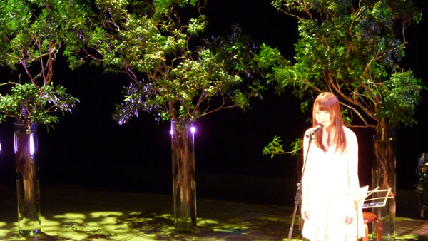 実際、ふんわりとした白いワンピースを着て現れたk-kは、妖精のようにかわいかった。そんな彼女は「神聖な想い」「ハイネ」「小鳥」の女子号泣ナンバー3曲を披露。直立不動で歌うその歌声は、不純物がなくサラサラと澄んで、声質自体がせつない。それはまんま、銀色の詞が有する特徴でもあり、ゆえにk-kが無心で歌うとそこには自然と銀色夏生の世界が静かにくっきり浮かび上がった。