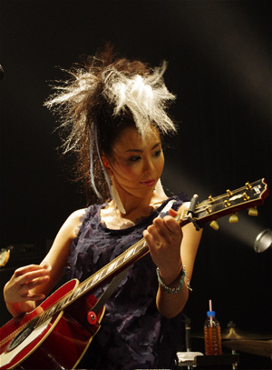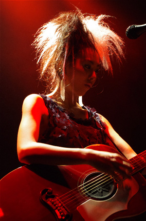 壮大な音楽のなか、黒のノースリーブミニワンピに赤いギターを抱えてLOVEが登場。高音が少しハスキーになる魅力的な声で歌い始める。テンションの高い曲、超元気な曲が続いたと思えば、ためらいの匂いがするような曲まで。彼女らしい表現方法で場を作っていく。LOVEライブ初体験である私もいつか、彼女のリズムに乗せられていた。