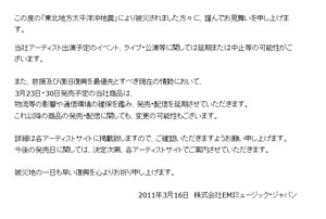 東北地方太平洋沖地震の被災状況を受けて、物流等の影響を考慮した大手レコード会社の新譜リリースの延期が相次ぐなか、EMI Music Japanも3月16日、23日、30日に予定していた新譜の発売、配信を延期することを発表した。