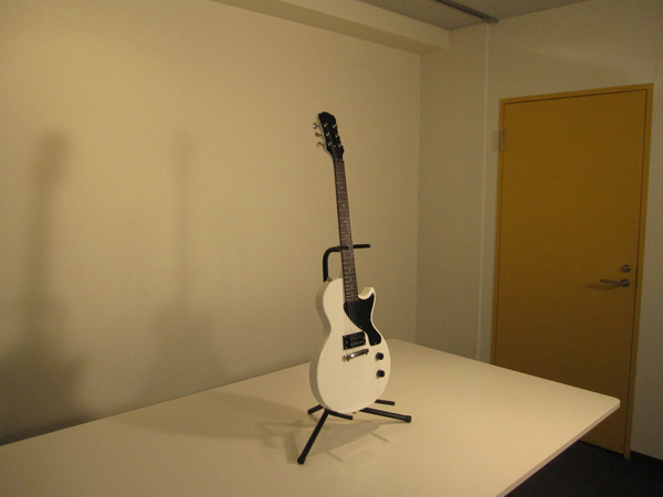 これが元になったギター。真っ白いボディと黒いピックガードのレスポール・タイプだ。これを『JET!JET!!JET!!!』前代未聞の全100種類ジャケットにちなんで、レインボーカラー仕様にしてしまおうという企みが行われた。