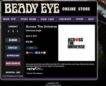 日曜日(4月3日)、ロンドンで日本支援コンサートを開いたビーディ・アイが、ザ・ビートルズのカバー「Across The Universe」をダウンロード・リリース(期間限定)した。収益は、東北地方太平洋沖地震の被災者を支援する英赤十字社の<Japan Tusnami Appeal>に寄付される。