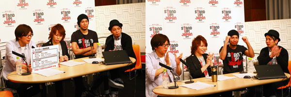 東日本大震災をうけて、T.M.Revolutionの西川貴教が発起人となりスタートしたチャリティ・プロジェクト「STAND UP! JAPAN 中央共同募金会」。より多くの支援の呼びかけと、被災地へエールを送るための生放送番組『被災地にエールを送ろう!今こそ立ち上がれ ニッポン!STAND UP! JAPAN』が、4月2日(土)15時から24時過ぎまで9時間に渡りニコニコ生放送で放送された。