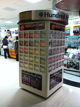 まあ、目立つこと目立つこと。誰もが目に入る絶好の場所に鎮座する巨大な立体ディスプレイ。25枚のCDが4面に配置されて合計100枚だ。Hundred Percent Freeのバンドロゴも円柱状の周りに配され、下段にはこのアルバムのインフォメーションが紹介されている。まさに前代未聞。長く音楽業界にいる編集部員でも、このようなディスプレイは見た記憶がない。