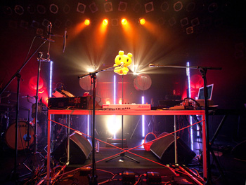 電子ノイズのSEとシンクロした挑発的なLEDの明滅の中、まずサポートのドラマー(城戸紘志/unkie)とベース(内垣洋祐/APOGEE)の2名が登場。左右に分かれて位置につくと、並んだバスドラムが四つ打ちを始めた。自動演奏出来る装置が組み込まれているのだ。