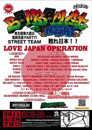そうした活動の中、4月28日(木)、渋谷club asiaで予定していた『東京RAGGA LOVERS 2』リリースパーティーもリリースパーティーという形を取らず、義援金募集を目的とするイベント<BOMBOCLAT NIGHT meets STREET TEAM -LOVE JAPAN OPERATION->として、同日同時刻同開場で開催することになった。