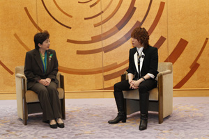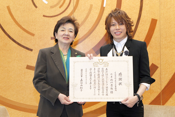 滋賀県の“ふるさと観光大使”を務めるT.M.Revolution 西川貴教が、4月15日(金)、同県の嘉田由紀子県知事を表敬訪問。嘉田知事より感謝状が手渡された。