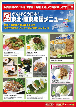 また、ビッグエコーでも義援金募金などを展開、同時に「がんばろう日本!東北・関東応援メニュー」が用意され、その価格の10%が日本赤十字社を通じて被災地に送られることも発表された。応援メニュー第1弾として登場するのは、浪江風焼きそば(福島)/盛岡じゃじゃ麺(岩手)/おかか・明太おにぎり(岩手)/漬け物盛り合わせ(福島・宮城)/みそピーナッツ&かきピー(千葉)/いわしの竜田揚げ(千葉)/笹かま(宮城)/銘菓盛り合わせ(茨城・岩手・宮城)/納豆アイス(茨城)/ずんだアイス(宮城)といったラインナップ。5月1日から順次スタート、全店(3月末現在279店舗)で実施され、夏にはメニュー内容がさらに一新され9月末まで実施していくという。ビッグエコーがちょっとした東北旨いもの市になるなんて、ナイスプロジェクトだ。食べれば食べるだけ支援に直結するのもうれしい話。
