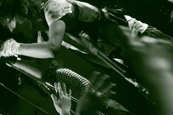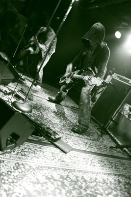 そして20:13ステージにMCが登場し「are you exciting?」と会場を煽るなか、バンドのメンバーがステージに現れる。その中の一人、黒のパーカーをはおり、フードをすっぽり被った男がギターを抱え、センターのマイクの前に立つ。その瞬間爆音で1曲目が始まった。曲は「No Name」。INORANだ! もの凄いテンションの演奏だ。曲目をメモろうとする手が震える。小さなライブハウスのステージにINORANが立っていることに興奮しているのかと思ったが、すぐにそうではないことに気づく。演奏だ。異常なまでの集中力と爆発力を備えた演奏だ。会場の温度が軽く2~3度は上昇したと思う。前にいた女性がもう覚悟を決めたように音に身を委ねて行く。2曲目はアルバム『Teardrop』のリード曲「SuperTramp」。CDで聴いた段階から全身の血が騒いだとびっきりハードなナンバーだ。それがライブで演奏される…この瞬間、会場に居ただれもが思ったはずだ「ロックを愛していてよかった」と。快楽!快楽!快楽!ひたすら身体が気持いい。