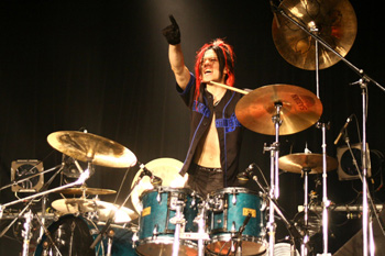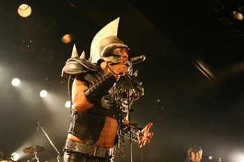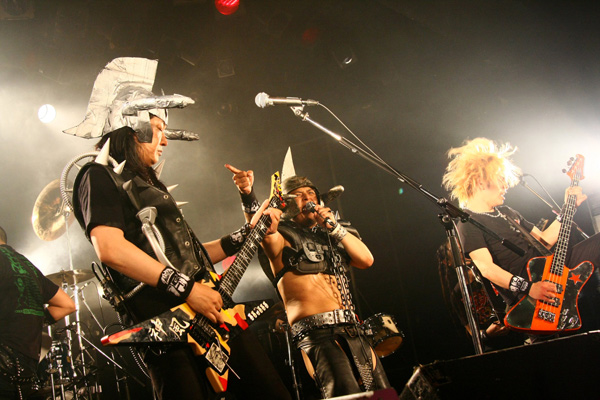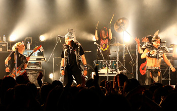 続くのはSEX MACHINEGUNS。代表曲のひとつ「みかんのうた」で始まったステージは、異様なほどテンションが高い。インディーズ・チャート1位になった新曲「37564」や、久しぶりにライヴ・メニューに組み込まれた「アメリカンZ」など、メタルの真髄を極めたナンバーを次々にたたきつけた。また4月28日と言えば、ANCHANGの誕生日。アンコールでは、41歳を祝うバースディ・ケーキが両バンドのメンバーから贈られた。さらに「いくらなんでも冠の格好は行き過ぎ、あれは着れない」とこのツアー中に何度もこぼしていたANCHANGに、SEX MACHINEGUNSのメンバーから特製のシャワーヘッド付きメタル・ベスト、冠からは夜なべで段ボールとガムテープ制作した鉄かぶとも。それをANCHANGに半ば無理矢理に着用させ、両バンド勢ぞろいでメタルを炸裂させた。