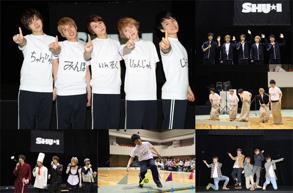 この日、行なわれたのは、草食系男子なSHU-Iによる<春の大運動会>。SHU-Iメンバーが旗を持っての入場行進から始まり、選手宣誓、国民体操(日本でいう「ラジオ体操」の韓国版)を行なったのち、いよいよ運動会本編がスタート。羽子板の羽子のようなジェギを限られた時間内で何回リフティングできるかを競う「ジェギジェギ」や、バットを使って、グルグルまわって、平衡感覚がなくなった状態で得点が書いてある旗をゲットする「くるくるビーチフラッグ」、さらに「玉入れ」や「障害物&仮装競争」、SHU-Iがレギュラーを務める、BS JAPAN『MADE IN BS JAPAN』の司会者・森田アナウンサーも参加しての「借り物競争」などでメンバーは奮闘。そして集まった多くのファンも、SHU-Iの頑張る姿に声援を送った。