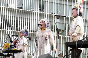 お天気快晴!「TOKYO M.A.P.S YUKIHIRO TAKAHASHI EDITION」2日目がスタート。今日のトップバッターは4 bonjour’s parties です。J-WAVE 月~木14時からのワイド番組「Rendez-Vous」のテーマ曲やジングルを担当しています。番組に高橋幸宏がゲスト出演したときにジングルを聞いて「いいんじゃない?誰が作ってるの?」というのがきっかけで今回のTOKYO M.A.P.Sに大抜擢されました。カラフルな帽子をかぶって登場した8人組。ギター、ドラム、ベースにフルートやトランペット、アコーディオンも入って、魔法の国の音楽隊のようなアーティスティックなパフォーマンスでした。