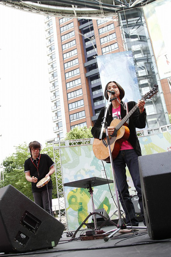 2人目は高野寛。昨日はTYTYTのメンバーとしてトリを務めた高野寛。ソロのステージはまたうってかわった雰囲気。高野のギターとパーカッションの2人だけで「節電仕様」の編成です。午後のやわらかな日差しの中にのびやかな歌声がぴったり。会場も大いに盛り上がりました。