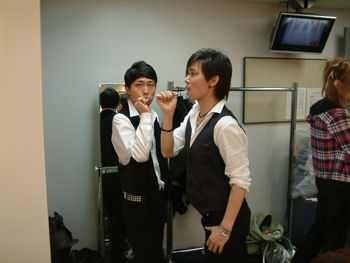 本番までの時間は、集中する人あり、小寺&和田のようにふざけあうメンバーあり。エレベーターホールのほうからは発声練習をするTAKAの声が聞こえる。
