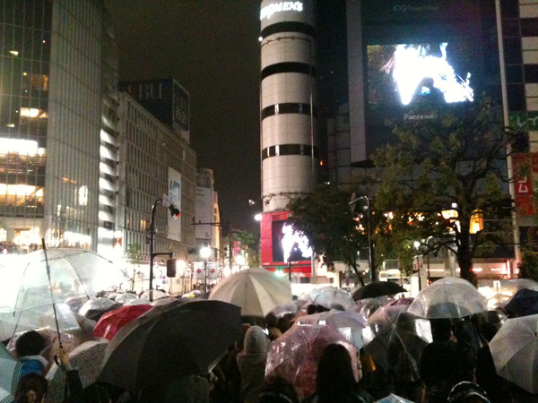 21時45分、映像が流れた瞬間、ファンからは歓声とも悲鳴とも区別がつかない声があちらこちらから発せられ、その声も、ビジョンから流れるギターとドラムの音に、一瞬にして掻き消され、1500人のファンの他に、その“異様”な状況にたまたま居合わせた歩行者も巻き込み、多くの“群衆”がビジョンやバスの画面を食い入るように見ているといった状況が映像が終わるまでの3分半続いていた。