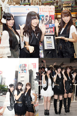 AKB48最強クラスの雨女である柏木由紀が所属するフレンチ・キスだけに、この日は、当然とも思える雨模様。フレンチ・キスはこの日の早朝、メンバーもよく訪れる渋谷109に登場したフレンチ・キスの巨大看板を訪れて“渋谷初進出”の写真を撮影するところからスタート(AKB48、派生ユニットとして109の巨大看板はフレンチ・キスが初)。さらに、渋谷のTOWER RECORDS、TSUTAYAといったレコード店を訪問した。