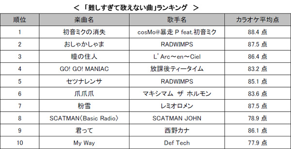 難しすぎて歌えない曲」ランキング、TOP10発表