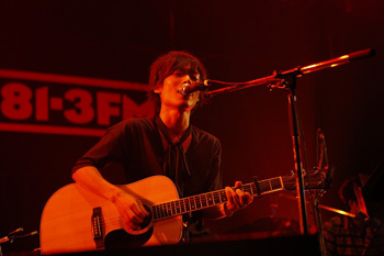 イベントに最初に登場したのは、高橋 優。会場に深くおじぎをすると「短い時間ですが、せいいっぱい歌います。ここにいる皆さんと被災された皆さんに少しでも笑顔がふえますようにという気持ちをこめて歌います」と「福笑い」など3曲を熱唱した。