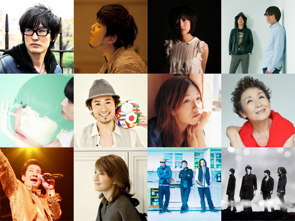 ▲写真(左上より右下)スガシカオ、秦基博、一青 窈、真心ブラザーズ、Salyu、ナオト・インティライミ、BONNIE PINK、加藤登紀子、KAN、My Little Lover、RHYMESTER、Mr.Children