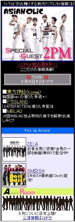 フジテレビは、K-POPアーティストをはじめとするアジアアーティストに特化したモバイルマガジンサイト「ASiAHOLiC」をフジテレビ音楽配信モバイルサイト「フジ♪メロ」内にオープンした。創刊号は2PMが特集を飾っているほか、ZE:A、SM☆SHなどが登場している。
