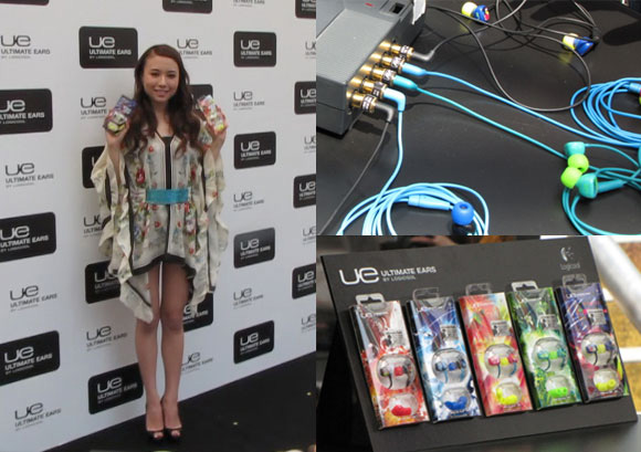 ▲May J.はカラフルなイヤフォンに合わせた花柄の衣装で登場(左)。ライブを聴くにはイヤフォンが必要(右上)。使われたのはカラフルな5色を揃えたUE100(右下)