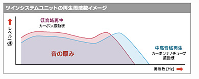 中高音域再生用のユニットでは、業界初となるカーボンナノチューブを振動板に採用している。具体的には、PET素材のベースにカーボンナノチューブをウェットコーティングするという手法で、軽量かつ剛性の高い振動板ができたという。「当初はさまざまな金属振動板を探したが、適度な内部損失をもち、軽量で応答性の高い素材は見つからなかった。結晶構造がカーボンと異なるカーボンナノチューブは、アルミニウムの半分の軽さで鋼鉄の20倍という剛性を持つ。固有振動数が高いため、音の反応が早く、緻密(ちみつ)で繊細な音表現が可能になった」(同氏)。