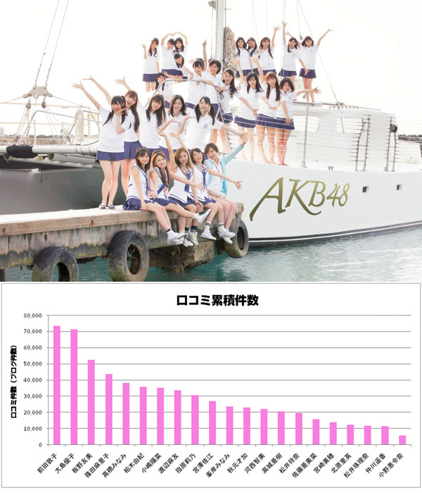ヒートアップする<第3回AKB48選抜総選挙>の実施にともない、メンバーのネット上でのクチコミランキングが発表された。対象としたブログ件数は、2億2161万6973記事。CDを購入するというアクションを起こすコアなファンを対象としたのが<AKB48選抜総選挙>だとすると、こちらはファン予備軍やライトなファンも含めた形のランキングとも言えるかもしれない。