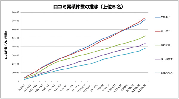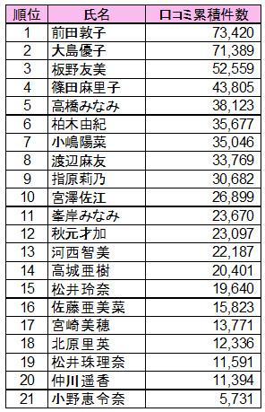ランキングトップに立ったのは、前田敦子(73420件)。さらに2位には大島優子が71389件と続く。その差は約2000件で、調査期間内に両者の順位は2度入れ替わったことがあることからも、接戦であることがうかがえる。