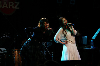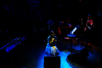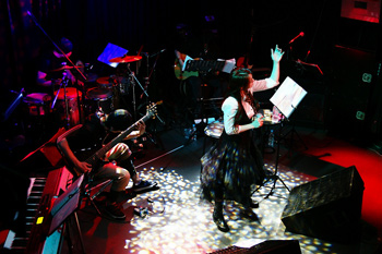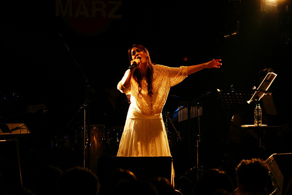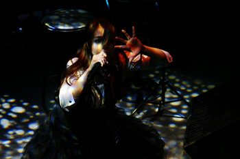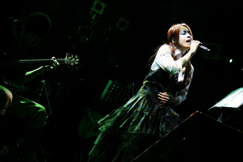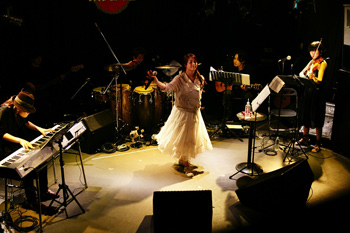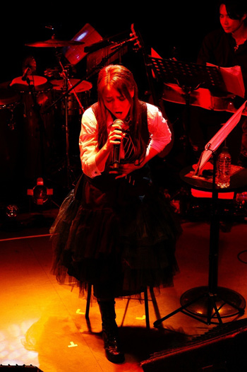 映像が終わり、ANZAが現れる。オフホワイトのニットに白のロングスカート。本人曰く、白ANZA。HEAD PHONES PRESIDENTのANZAとはまったく違うナチュラルさだ。1曲目は、ANZA語で。そして、アイドル時代の「Dream」。続いて、2006年に発売されたANZAのソロ曲「彼方へ」と「翼」。バンド活動が中心の彼女、ソロ曲を歌うのはとても久しぶりとのこと。