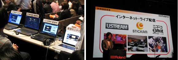 ▲発表会では、Ustream、Stickam、ニコニコ生放送をはじめとするライブ配信の盛り上がりと、それに対するローランドの取り組みを紹介。発表会の模様はライブ配信され、会場に来られなかった人も見られるようになっていた。