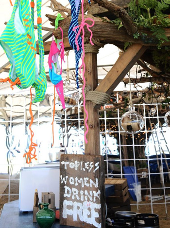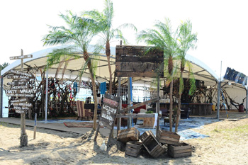 会場に現れたDIESEL ISLANDエリアは、ツリーハウスを中心に据えたバーや、ディーゼルらしいアイロニーの利いた看板、たくさんのハンモックが吊るされビーチリゾートの雰囲気が存分に演出されていた。フロアにはディーゼルの象徴であるデニムをつなぎ合わせたラグが敷かれており、夏先取りのビーチガールズも出没、夜になるとランプがリラックスムード漂うアイランドを幻想的に照らし出した。