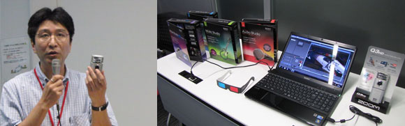▲発表会にはZOOMスタッフが同社のビデオレコーダーQ3HDを携えて登壇(写真左)。「Vegas Movie Studio HD Platinum 11」には赤/青メガネも同梱される(写真右)。
