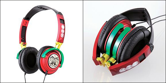 ▲「仮面ライダーオーズ ステレオヘッドフォン」。持ち運び時には、折りたたむこともできる(右)(c)2010 石森プロ・テレビ朝日・ADK・東映