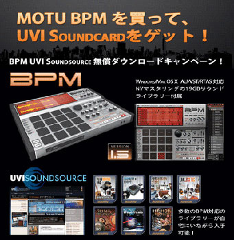 キャンペーンは、期間内(2011年7月31日まで)にHRオンラインストアもしくは全国の販売店にて、MOTU BPMを購入、申し込むことで、UVI Soundsorceで販売している対象製品(Plugsound Pro、HipHop Planetなど)の中から、希望のライブラリーを1つをプレゼントするというもの。
