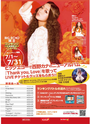 <ビッグエコーで西野カナのニューアルバム「Thank you,Love」を歌ってLIVEチケット&グッズをもらおう!!>と銘打ち実施されるこの企画は、全国のBIG ECHO限定で実施されるもの。6月22日にリリースされた西野カナの3rdアルバム『Thank you, Love』収録楽曲が課題曲となり、そのいずれかをBIG ECHOの「ランキングバトル」に参加して歌唱し、上位に入ると、9月9日(金)日本武道館で行なわれる西野カナのライヴ・チケット(5組10名)をはじめ、プレミアム・グッズがもらえるというファン垂涎の企画だ。