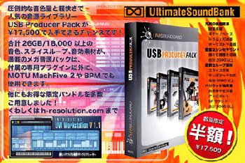 ハイ・リゾリューションは、仏UltimateSoundBankの音源ライブラリーパッケージ「USB Producer Pack」などについて通常価格より約50%オフとなるキャンペーンを2011年6月29日より数量限定で実施中だ。