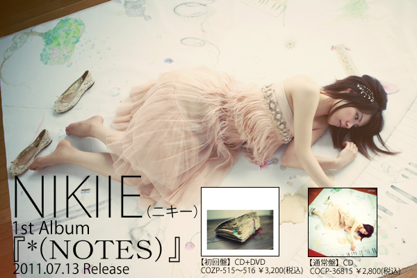 2010年12月にマキシ・シングル「春夏秋冬」でデビューしたNIKIIEが、この夏にファースト・アルバム『*(NOTES)』をリリースする。ライヴでは鍵盤での弾き語りを基本とする彼女は23歳のシンガー・ソングライター。まるで小動物のような愛らしいルックスながら、歌い始めるとパワフルで、時折、鋭い視線とメッセージで聴き手に迫る。彼女が幼い頃から音楽に心を寄せたのは、周りの人とあまり馴染めず、いつでも不器用に孤独と戦っていたからだ。今回のアルバムには口ずさみやすくて優しいメロディがたくさん詰まっているが、そこにある想いは切実で、どんな現実があろうとも前を向いて明日を切り拓きたいと願う彼女のひたむきさが滲む。今作にはデビュー曲にして全国FM局のパワープレイ女性アーティスト最多獲得記録を樹立した「春夏秋冬」、ドラマの主題歌にも起用された「幻想フォルム」も、CMソングとして耳にしたことも多いはずの「HIDE&SEEK」も収録。まだの人も是非、今こそNIKIIEの、珠玉のポップ・ソングたちに触れてもらいたい。