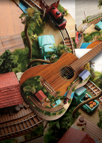 その後も、この趣味は止まる事を知らず、ついに今回の市販にまで至ったというわけだ。マーチン製のミニ・ギター(Martin LXK2)をベースに、セイシェル島のリゾートをイメージした架空の楽園を再現したジオラマ・ギターを開発、受注生産で市販するというプロジェクトだ。
