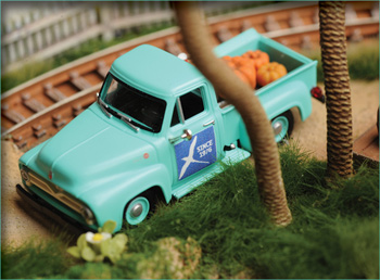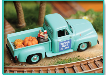 『セイシェル』は高中正義の1976年に発表したソロ・デビュー・アルバムのタイトル。模型をよく見るとトラックの側面には『SINCE 1976』と書かれ、同アルバムのジャケに登場するTROPIC BIRDS(シラオネッタイチョウ)のイラストが描かれているし、線路を走る列車にはデビュー40周年記念して『40EXPRESS』とペイントされるなど、細かい所にもこだわりを見せる。