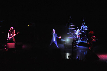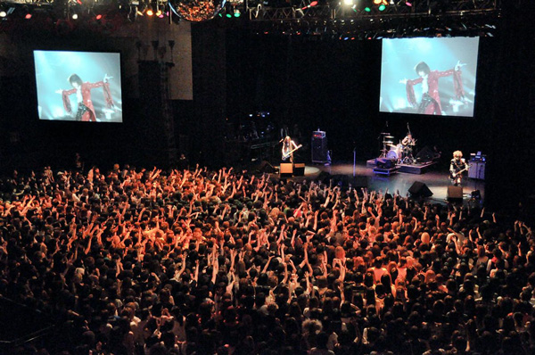 続くthe studs名義のステージでは、aie(G)、yukino(B)、響(Dr)が登場。ライヴ映像を用いたパフォーマンスの他、ギタリストのaieが歌うという趣向も。そして最後、蜉蝣としてのステージは、この夜のために再集結した前出のユアナ、kazu(B)、静海(Dr)の3人が、映像のなかの大佑と合体する形で実現。ことにステージ中央のスクリーンに等身大の彼の姿を映し出しながらの「絶望にサヨナラ」には、まるで生前の大佑がそこにいるかのような生々しさがあった。そして最後はkazuの呼びかけにより、大佑の音声も用いず、ゲスト・ヴォーカリストを呼び込むこともなく、「3人の蜉蝣と、蜉蝣を愛するオーディエンスの歌声」のみで、看板曲のひとつである「縄」を。その大合唱は間違いなく天国の大佑の耳にも届いたに違いない。
