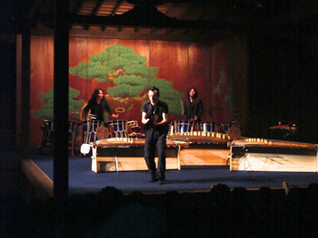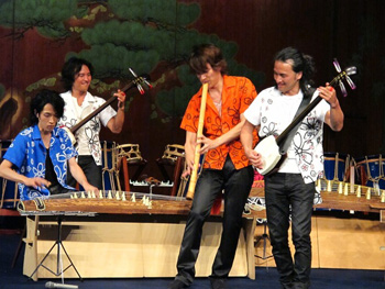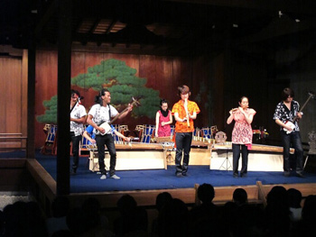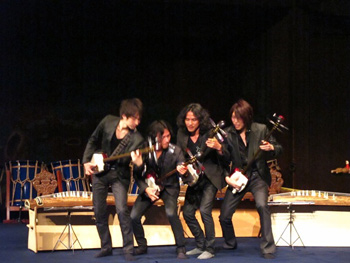 続いて、AUNの二人と秀による「カルペディウム」。迫力あるステージ、和太鼓とチャッパ、打楽器の共演だ。そして、ライブごとに成長していく男4人による三味線「プレイバック」。2010年のライブで、EXILEのようだと書いたが、ついに今回は、縦に並んで身体を回してみせてくれた。演奏前には、中棹三味線と津軽三味線の音の違いを。