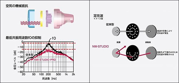 NW-STUDIOシリーズに搭載されているDUAL Anti-Standing Wave Systemは、振動板の面積に対して微細孔を1%に設定し、発生した空気抵抗により、通常は制御しにくい振動板自体の低域共振や各種共振を抑制。くわえて、振動板、放射孔、鼓膜が正対状態にあると鼓膜へ到達した音波が反射し発生する定在波を、放射孔を下部にのみ設けることで低減している。
