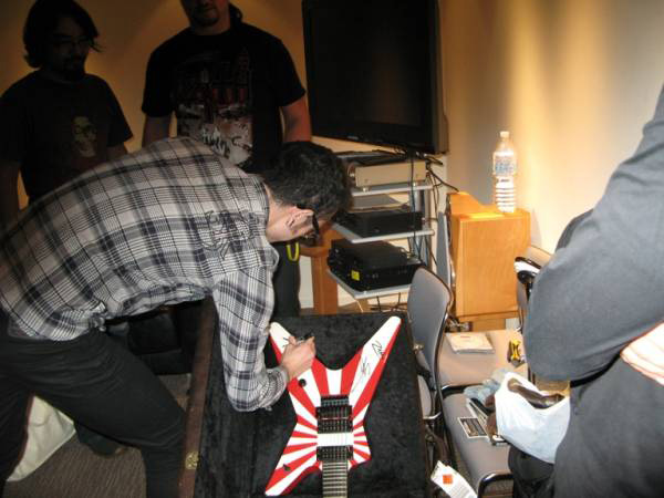 このギターは、通称「ライジング・サン」。過去ツアーで実際に使用したDeanのシグネイチャー・モデルで、日本をイメージしてデザインしたというカスタム・ギターだ。写真では確認できないが、残念ながら現在はヘッド部分が壊れているというが、日本の為になにかに役立てて欲しいとの思いで提供してくれたアイテムだ。現在、このギターにマシュー、コリィの直筆サインが入り、無事出品となった。