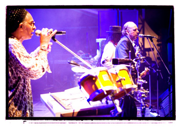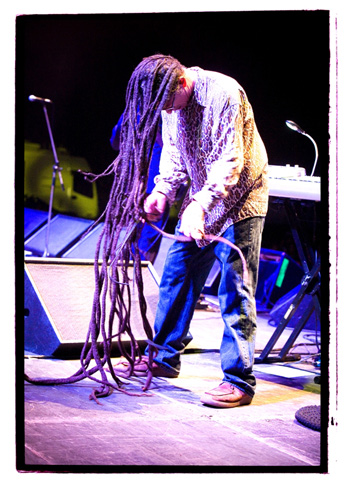 ドン・レッツはステージ向かって左側。途中帽子を放り投げると中から見事なドレッド・ヘアーがお出まし。長い!そしてお見事!なドレッドがあの大きな帽子の中にうまーく入ってたんですね。彼が髪を振り回すと、またまた会場中も盛り上がる(ちなみにステージが終わった後はすぐまた帽子の中に見事にたたまれて。それがまた違う帽子で、いったい何個もってるんだろ?見るたび会うたび違ったデザインの帽子で…)。