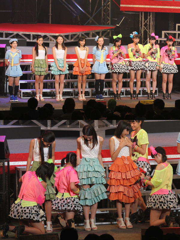 新メンバー発表を前に、つんく♂は、「スマイレージのサブメンバーとして、まず加入を決めました。」と、モーニング娘。にはない方式を取ることを発表。状況が飲み込めない和田彩花は、おもむろに口を開く。「私たちはサブメンバーになるんですか?」。そんな和田らしい素直な質問に、会場からは笑い声が漏れ、空気が少し緩む。誰もが「そんなはずはない。」と、思ったはずだ。ところが、つんく♂は、「サッカーでいうとJ1とJ2みたいにね。緊張感を持ってください。」と、その可能性を匂わせる。言うまでもなく、会場には再び、緊張感が走った。