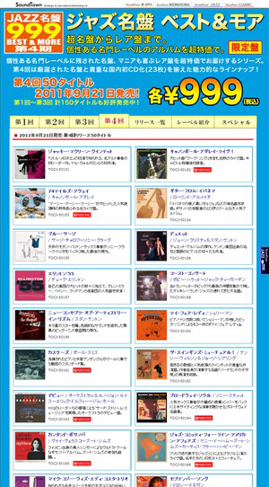 ジャズの名盤、レア盤を999円(税込)という破格値で提供する「JAZZ名盤999ベスト&モア」シリーズの第4期50タイトルの発売が、9月21日に決定した。「JAZZ名盤999ベスト&モア」は2010年9月22日に発売された50タイトルが話題となったことを機に、2010年12月22日には第2期として50タイトル、2011年4月20日に第3期として50タイトルが発売され、累計出荷枚数が40万枚を超えている大ヒットシリーズだ。
